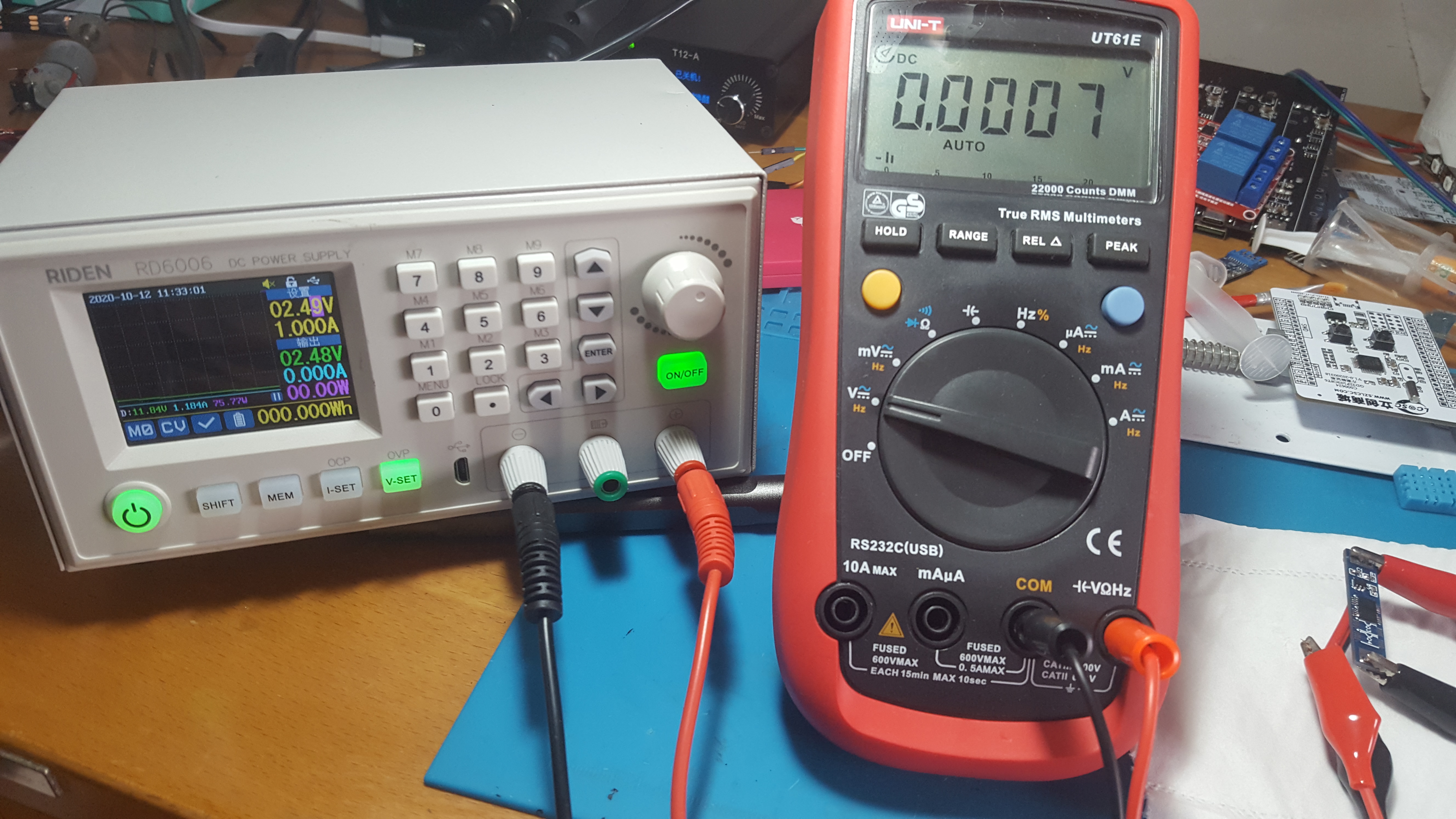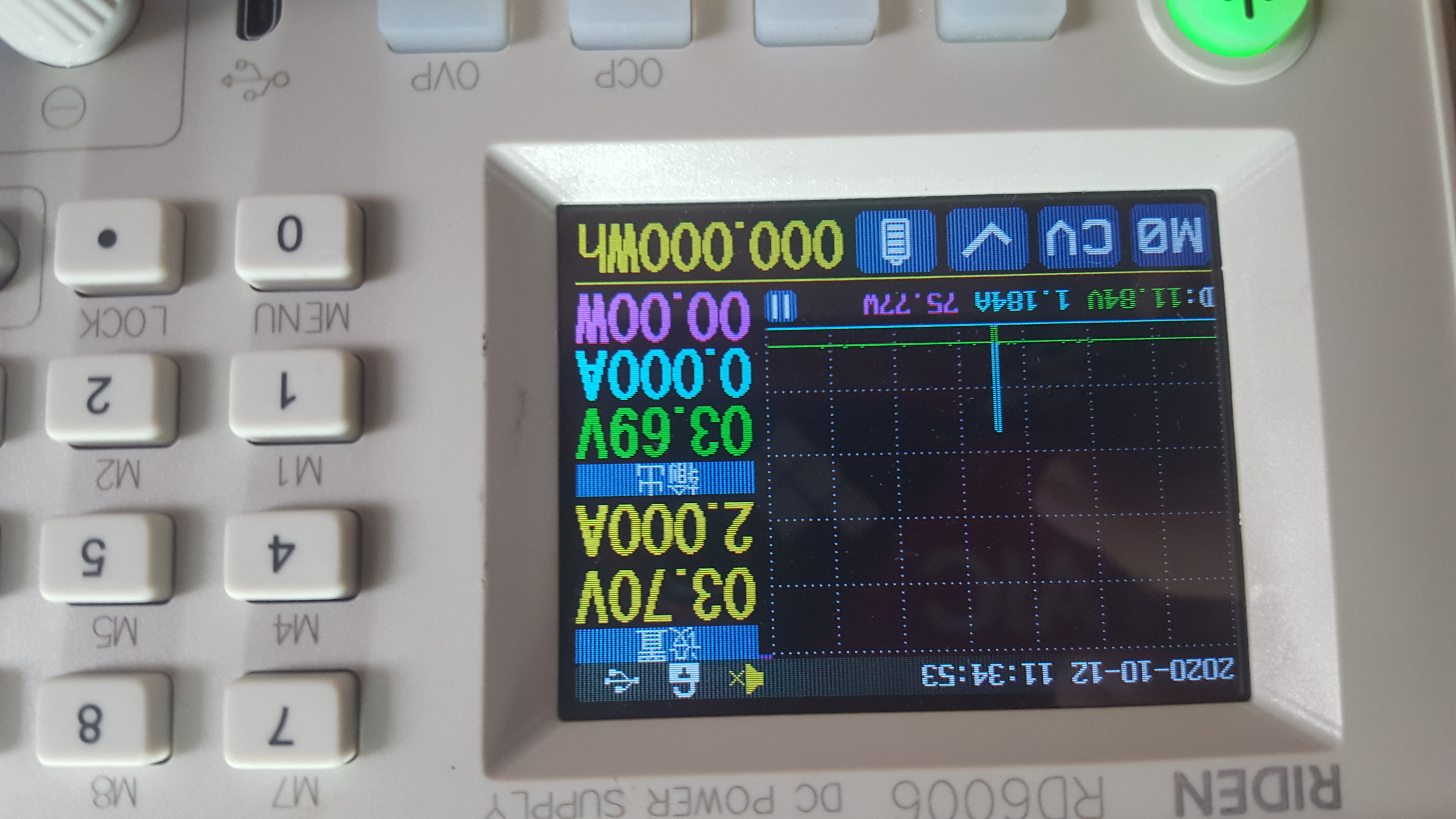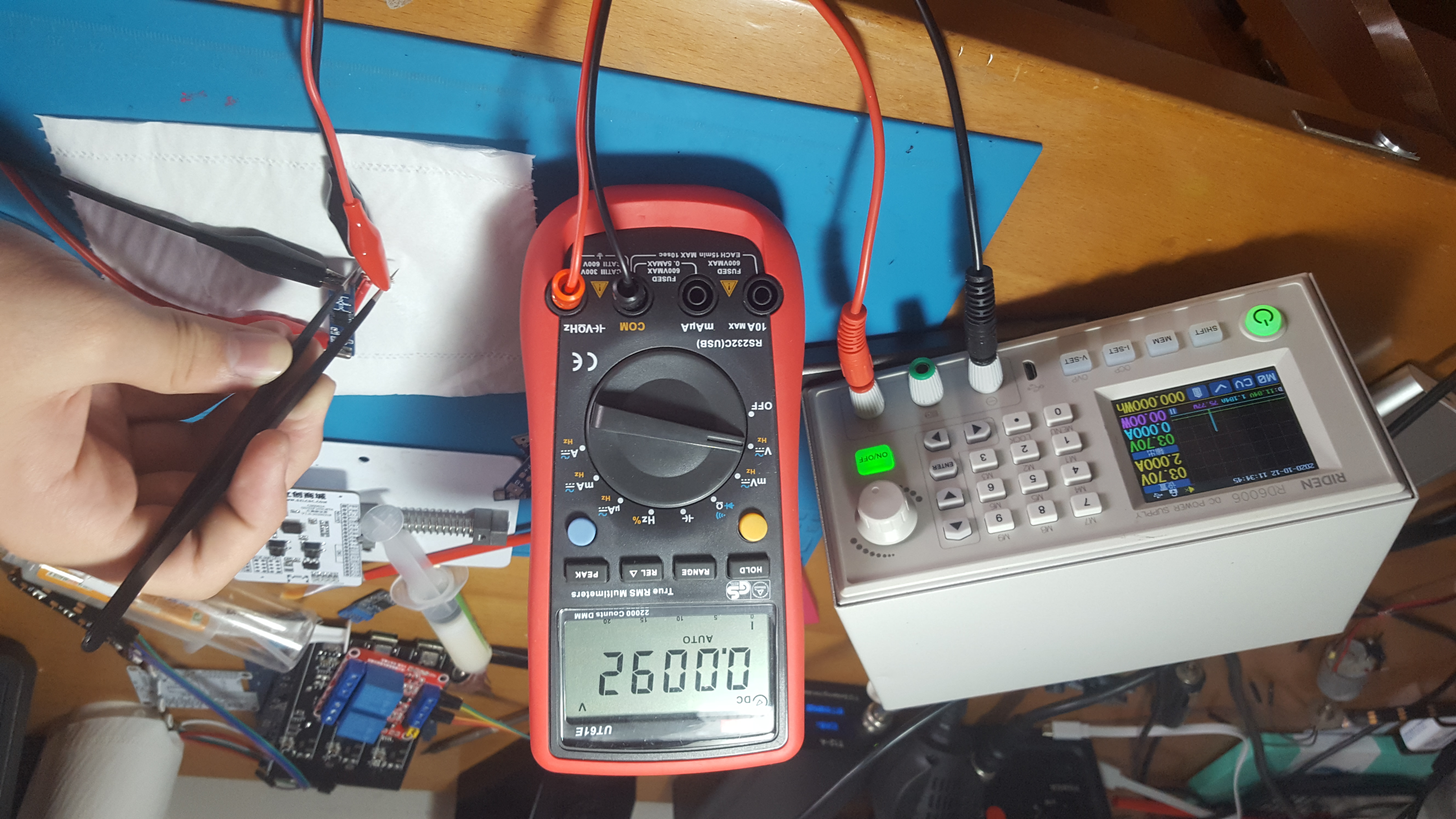 观察可调电源的电流曲线(蓝线,一格为1.184A),可以发现电流仅在一瞬间升高,后续因为保护板关闭输出恢复正常