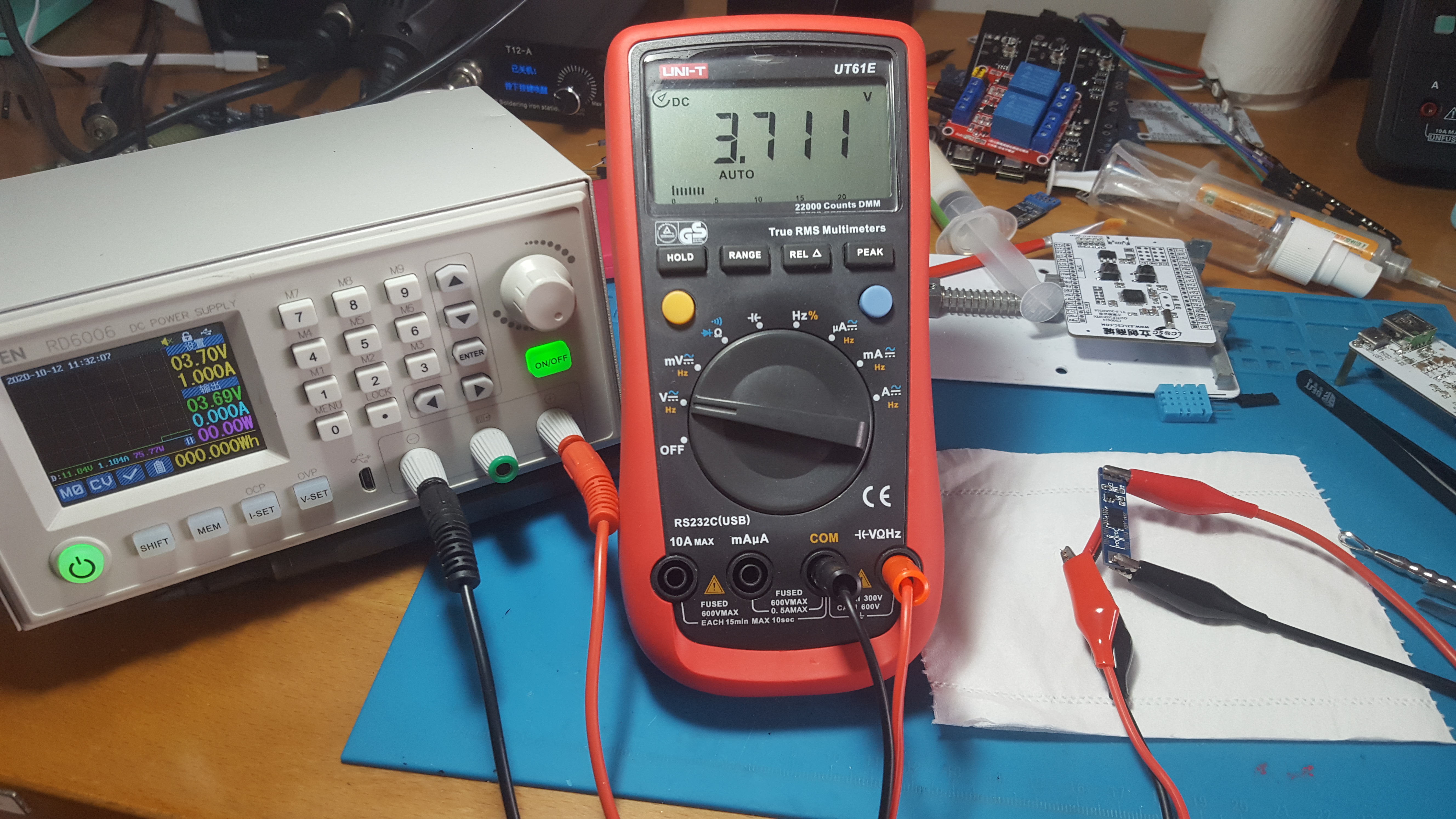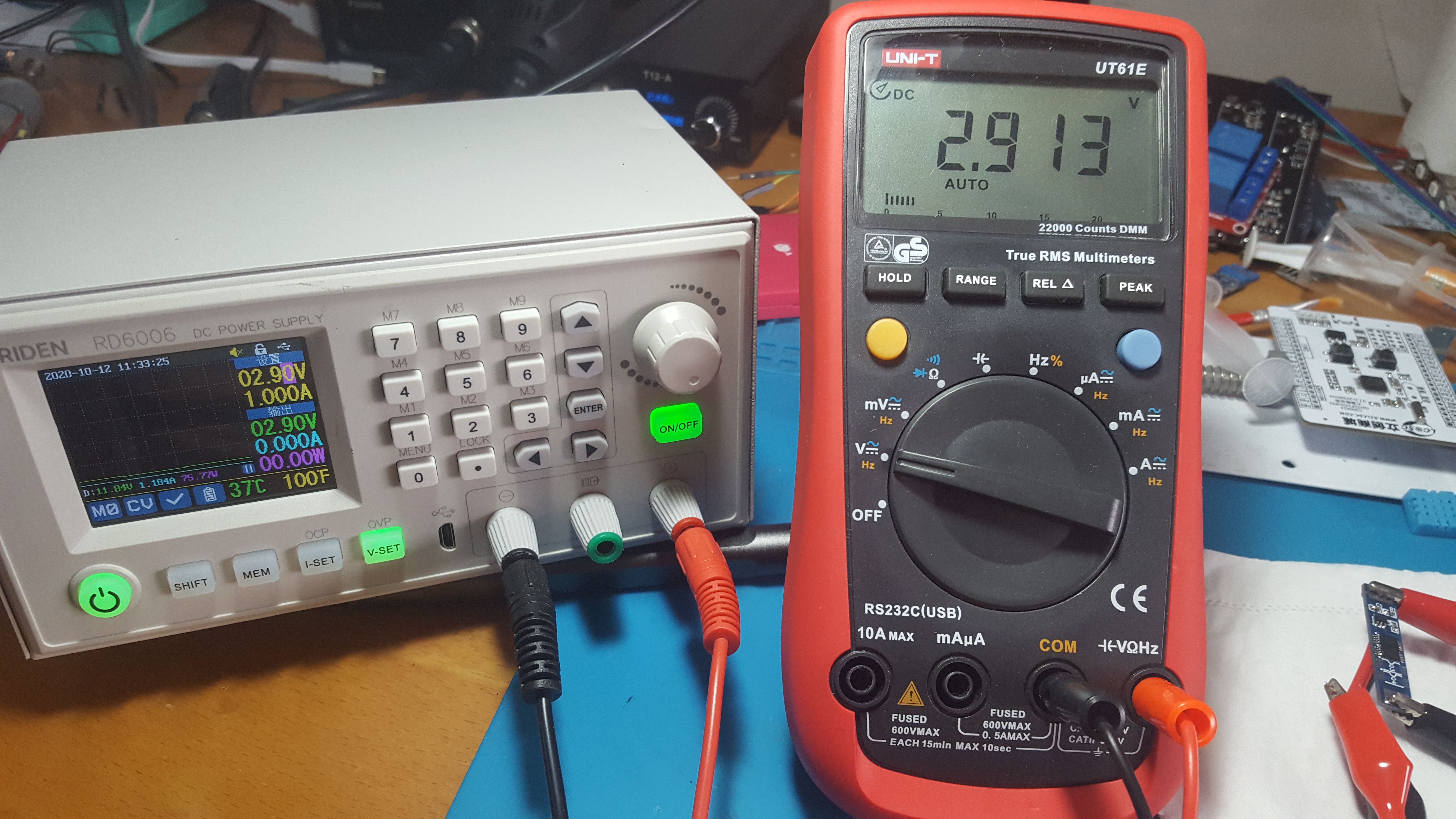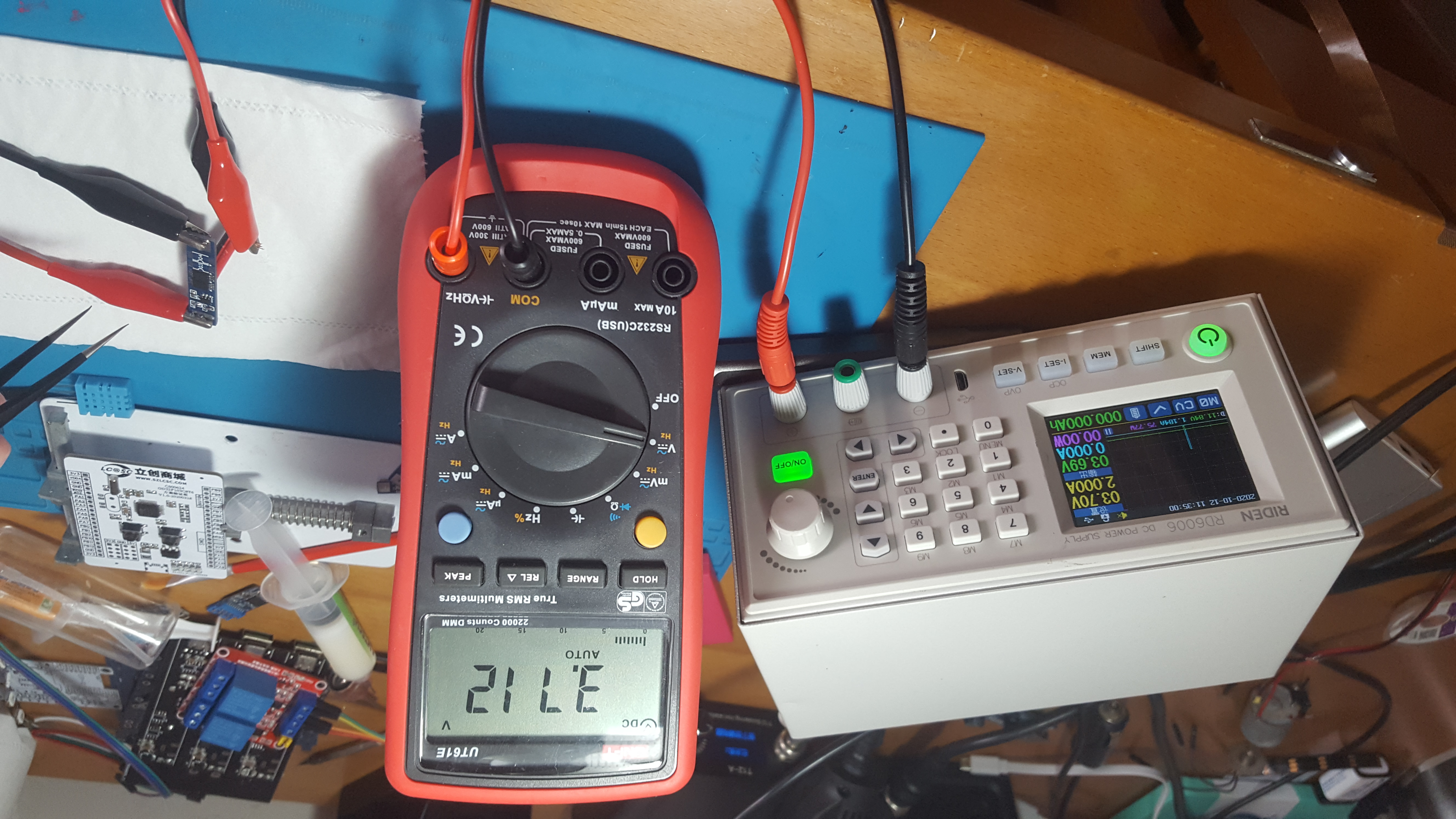 观察可调电源的电流曲线(蓝线,一格为1.184A),可以发现电流仅在一瞬间升高,后续因为保护板关闭输出恢复正常