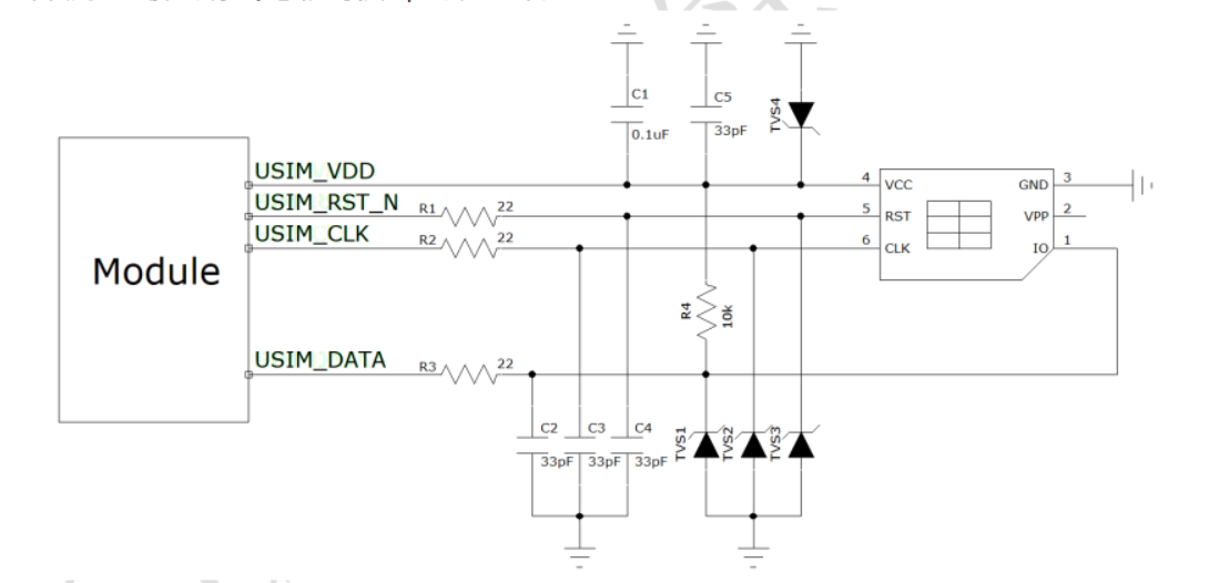(4). 为了保证良好的ESD保护,建议加TVS管,并靠近SIM卡座摆放。选择的ESD器件寄生电容不大于50pF。在