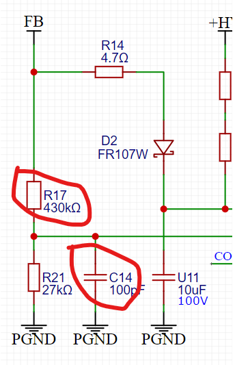 于是调整了R17的电阻为1206 430K,C14电容调整为100pF之前,反馈正常了。