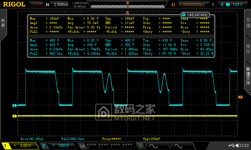 现在工作模式也处于了理想的QR反激模式。实现了谷底导通,另外调整了一下RCD吸收电阻的消耗电阻R5