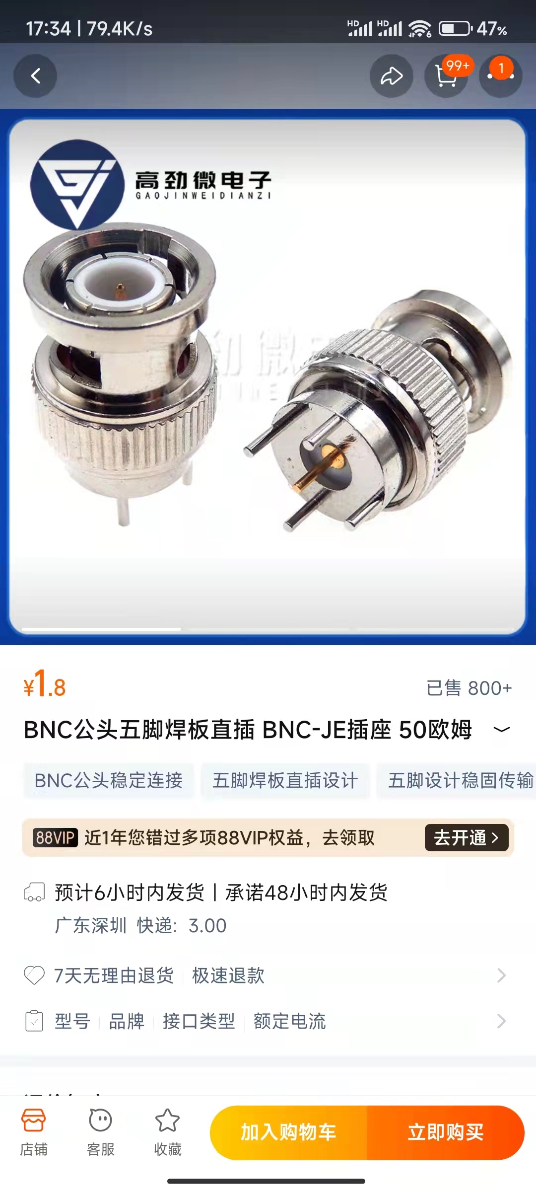后续:BNC公头是五脚焊接式的,需要掰掉两个脚