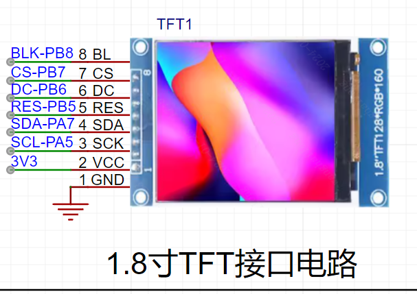1.8 寸TFT 是一款彩色显示屏,具有 128 x 160 个彩色像素,使用四线SPI通信方式与单片机进行连接。能够将采集到的信号波形、幅值、频率等信息显示出来。