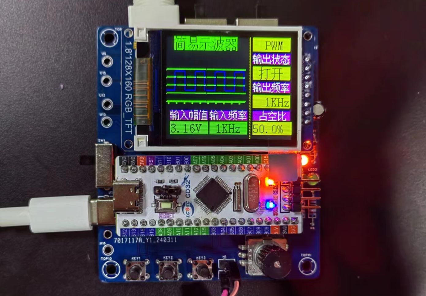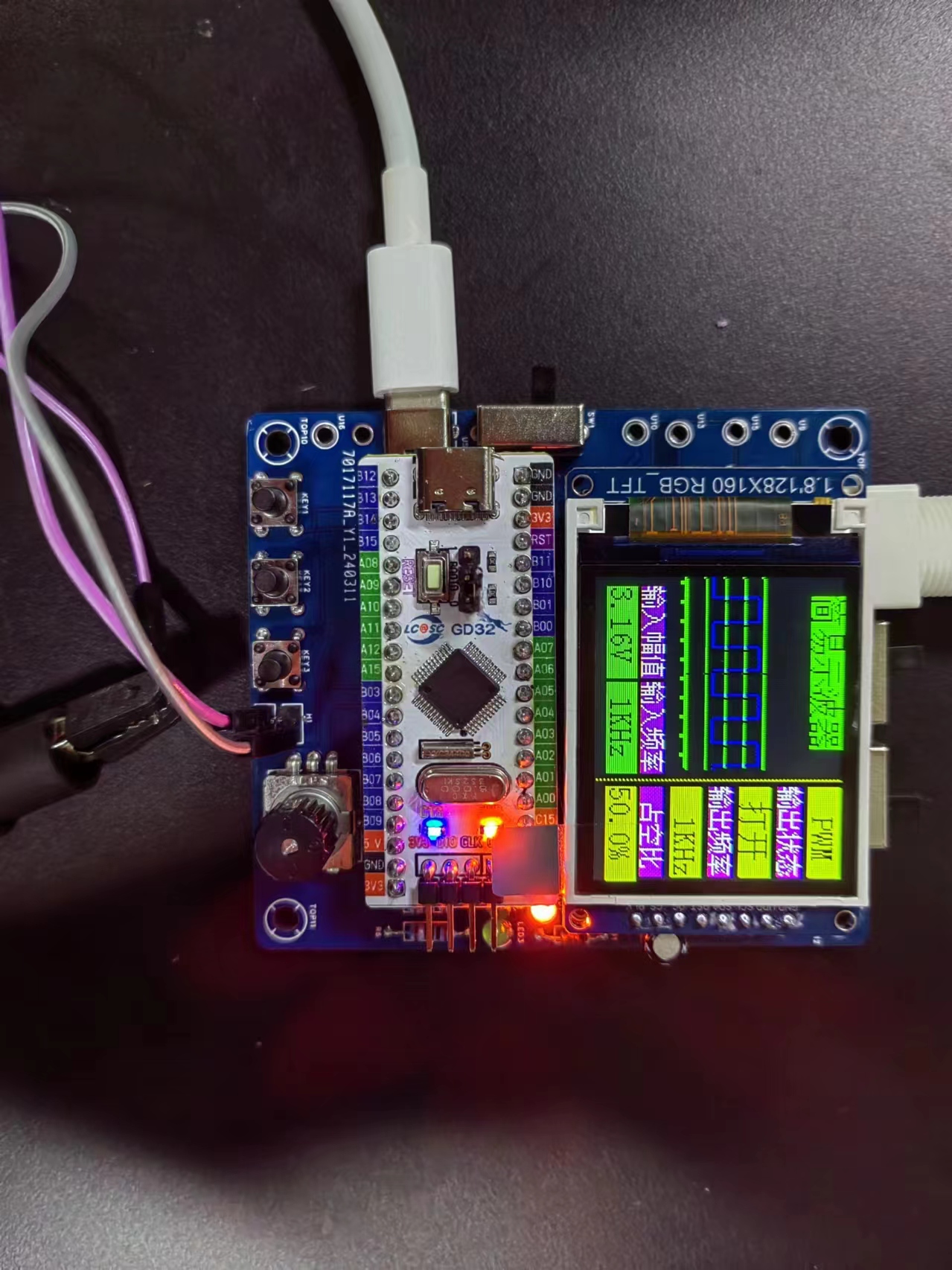 为了能有一台自己亲手制作的示波器,使用立创开发板推出的GD32核心板,1.8寸的TFT显示屏以及各种元器件制作出PWM波可调节输出的示波器。虽然只能测试低频信号,但这可是自己亲手制作的!嘎嘎有成就感。