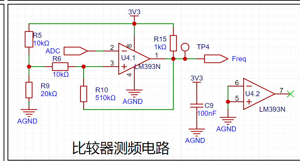 主要用于实现频率的检测功能,此电路为了增强电路的抗干扰能力,在单限比较器的基础上引入了正反馈,(千万不要忘记R15这个上拉电阻,没有上拉电阻示波器无法正常工作)保障了在一定范围内信号的稳定性。