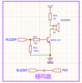 这个电路是基于 NPN 三极管的蜂鸣器驱动电路,核心功能是通过单片机 IO 口(PD6)控制蜂鸣器的发声,来自单片机的 IO 口,输出高低电平信号,控制蜂鸣器的通断,采用有源蜂鸣器(需外部提供驱动信号),一端接 + 3.3V,另一端接三极管 Q1 的集电极。