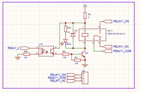 - 控制信号端(RELAY_2):来自单片机的 IO 口,通过 R26(1kΩ)限流后接入光耦 U18(6N137,高速光耦)的输入侧。