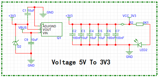 对于电源与低压差稳压器(LDO)电路,选择常用的3.3V低压差线性稳压器 AMS1117-3.3 芯片作为 5V 转 3.3V 电源与低压差稳压器。该芯片成本低廉且性能稳定,具有过压保护功能,有助于防止外部电压的突然增加对系统的损害。3.3V 正向电压与 GND 之间设置三组 10uF、100nF 电容,计划设置在板载微控制器芯片、颜色识别传感器、TFT 显示屏驱动的正向电压输入引脚,减小布线中产生的电压纹波、降低电源噪声和稳定电源电压,减少对芯片的干扰,提供给各个组件一个可靠的工作环境。这对于颜色传感器的准确测量和微控制器的稳定运行至关重要。
