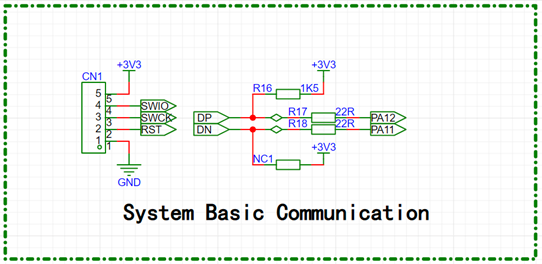 对于基本通信电路,引出 SWD 下载电路调试接口;Type-C 的DP、DN 差分数据线路通过22Ω电阻与微控制器 PA11、PA12 引脚连接,且 DP 数据线通过1.5KΩ电阻进行上拉,实现 USB 虚拟串口通信的硬件电路应用。