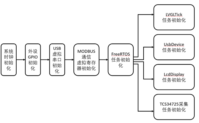 首先系统进行上电复位,进行 RCC 时钟树分频初始化,为各个外设和系统运行提供合适的运行频率;进一步进行外设的 GPIO 参数初始化,包括输入输出模式、输出速度限制、是否上下拉;进一步进行 USB 虚拟串口初始化、MODBUS 通信虚拟寄存器初始化,以便于 PC 端通过 USB s虚拟串口以 MODBUS 协议访问微控制器生成颜色测量系统的颜色、增益虚拟寄存器,读取数值;最后进行 FreeRTOS 任务初始化,共分为四线程任务。