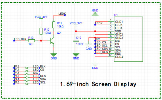 对于1.69寸彩色 TFT 显示屏外围电路,主要涉及到供电、显示控制、数据通信等方面。为确保1.69寸 TFT 显示屏提供稳定的工作电压,根据显示屏的规格,连接3.3V 电源引脚;连接微控制器的 SPI 引脚(MOSI、SCK)到 TFT 显示屏的相应 SPI 引脚。SPI 时钟频率设置正确,与显示屏规格兼容;连接微控制器的GPIO引脚到TFT显示屏的相应控制引脚(Chip Select、Data/Command、Reset),这些引脚用于控制数据传输、选择芯片、复位等操作;连接微控制器的GPIO引脚到TFT显示屏的背光控制引脚,以便可以调节背光亮度。