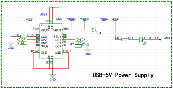 对于 Type-C 周围电路,引脚 CC1、CC2 通过5.1KΩ接地,通过数据线与 PC 端连接后,使该设备被选中为 SLAVE (从机)状态;USB 输入正向电压与板载正向电压间放置防防反接二极管,保证电路安全;引出 DP、DN 差分数据线路,作为 USB 虚拟串口通信线路;并在 VBUS 与微控制器一引脚间接入 LED 灯珠与一限流电阻,方便系统运行调试可视化。