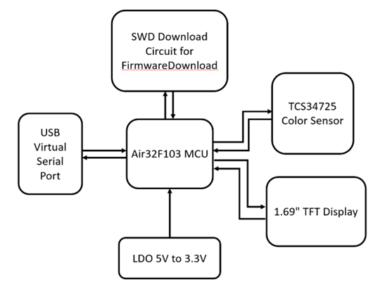 3) Air32F103 微控制器:I2C接口接收 TCS34725 传感器的颜色数据,进行数据处理与解析。同时,通过 SPI 接口与 TFT 显示屏通信,将处理后的数据发送给TFT显示屏进行实时展示。
