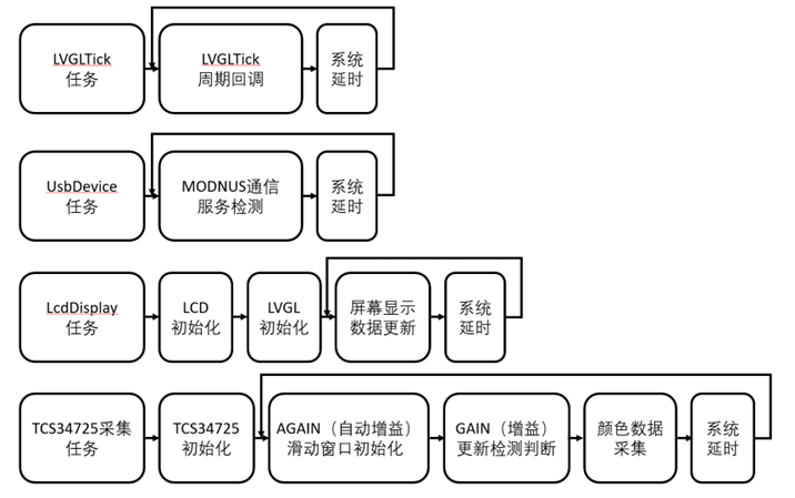 第一线程任务为LVGL显示刷新回调相关任务;第二线程任务为USB虚拟串口及 MODBUS 通信相关任务;第三线程任务为显示屏显示数据刷新相关任务;第四线程任务为 TCS34725 颜色采集相关任务。
