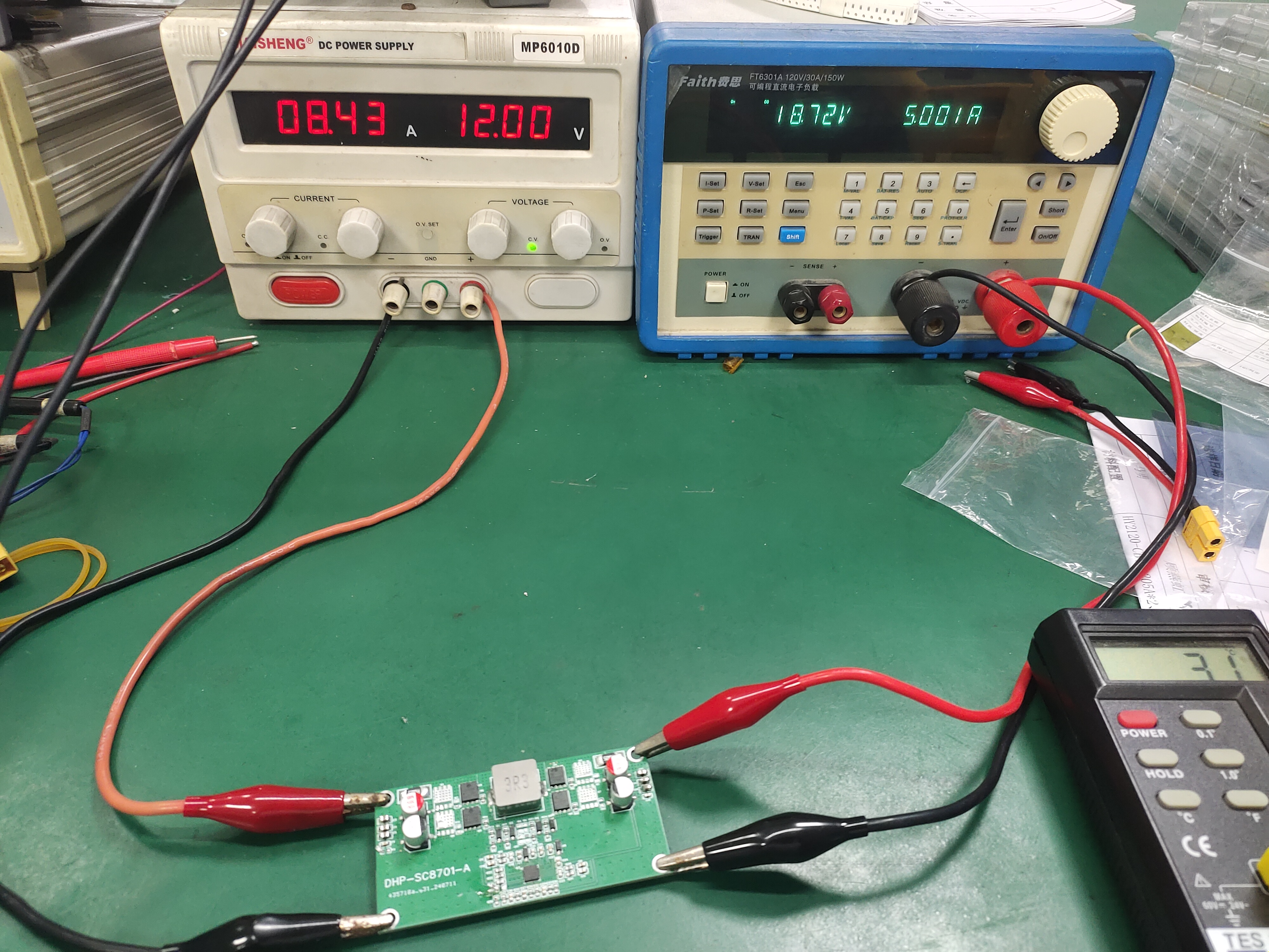 南芯SC8701这个料一开始嘉立创打板回来,直接就按照自己的原理图贴片,但是跟其他的小伙伴一样,接上电子负载仪,只能带个2A左右,而且MOS发烫严重,再往上调大电流就直接拉死了,直接跳保护了,而且IC也很烫,找不到问题点在哪里,第二次直接用开源里面大神画的板子,发嘉立创打样,回来发现还不如自己的画的板子,连个输出都没有,后面还是不死心,按照规格书和注意细节,重新画了一款4层板的,后面发现还是不行,上电直接短路,检查发现第14脚接地空焊了,好吧!只能重新补焊,上电不短路了,开机电流50mA,IC依旧发烫,温度达到60度,升压19V输出有了,也能带载了,但是发热依旧严重,后面再详细查看电路,发现原理图16脚反馈补偿与规格书的不一致,原理图一开始直接移植开源某位大神的,用的是15K+15nf,至于是哪位大神就不说了,后面直接修改成4.99K+47nF,此时IC依旧是发热,后面实在没有招了,直接换MOS,换一个开关时间短的,换上去之后,发现IC不发烫了,开机电流也为0了,直接带载5A测试,发现测试正常,温度不带散热片,放电2分钟上升到75度,可以接受测试波形也正常,查看MOS开启时间超过70ns,为了保守起见还是把IC第8脚悬空,测试正常后,又重新捣鼓开始画的版本,按照后面的把该改的都改了,发现测试正常了,总结这次开发的情况,在没有厂家支持的情况下,只能自己不断摸索,但是代价有点大,打了3次板才找到问题所在,实在惭愧,技术水平有限,也被其他的大神的原理图误导了,还是要遵循厂家的规格书,不然会走很多弯路,同时MOS的选型很重要,严重会影响IC的发热,所以当你调试不通的时候,适当更换一下MOS管。
