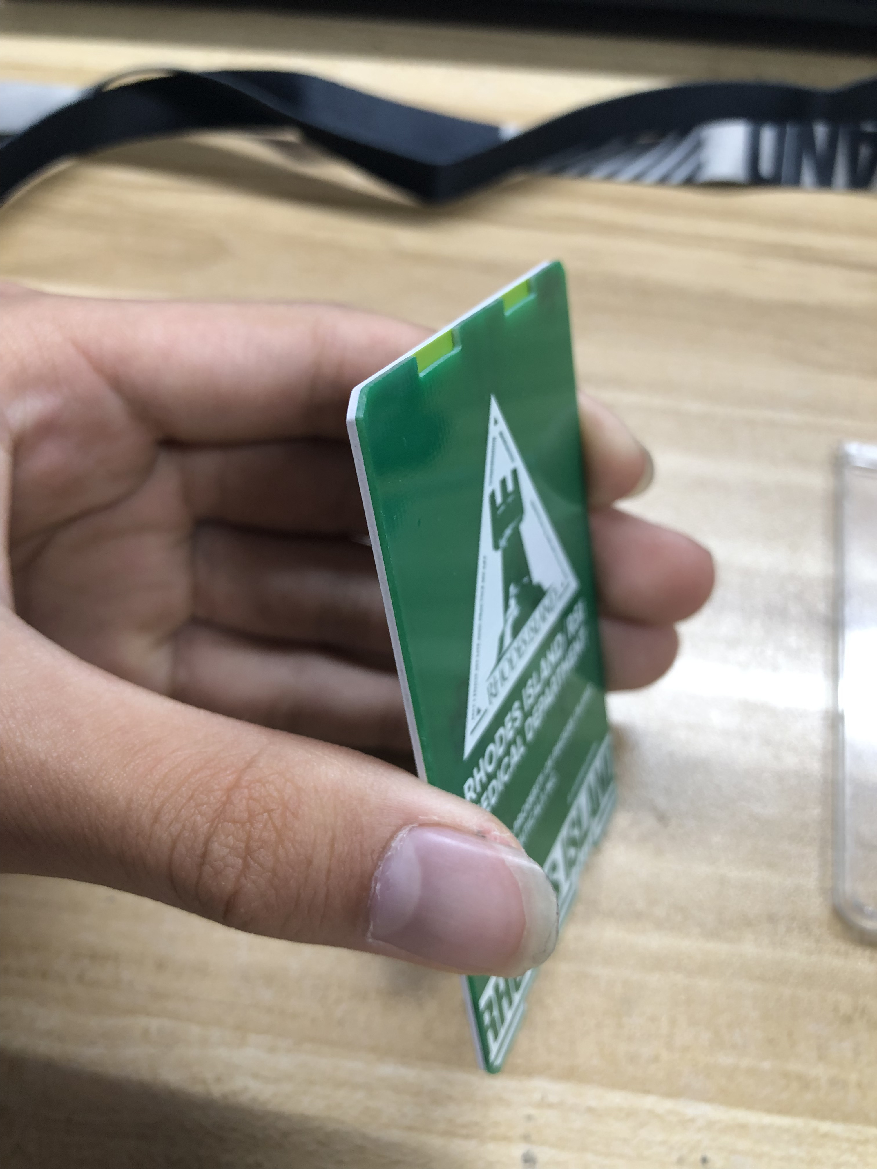↓ 大小与工牌卡片完全相等!打样板厚选0.8,可以的话尽量薄,太厚不好划上卡扣(图中的是0.8板厚,和标准卡差不多)