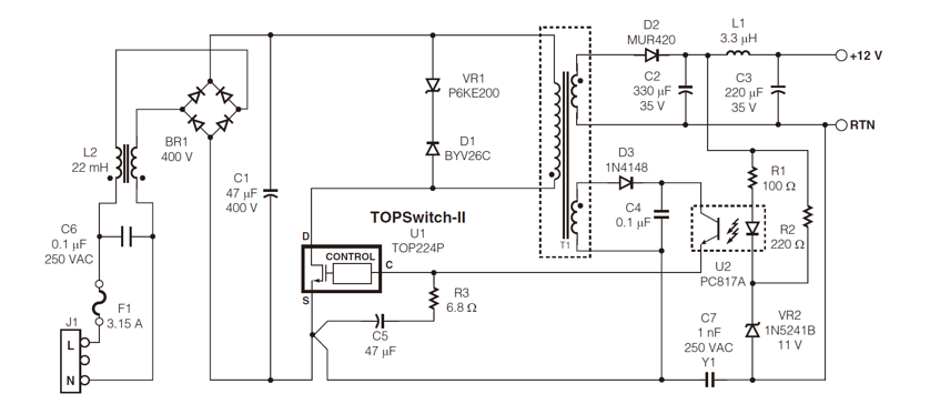 图 1 基于TOP22X系列反激式开关电源电路图 |