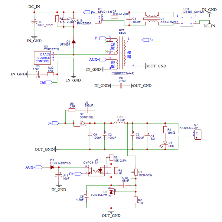 这部分由TOP227YN和变压器原边组成,肖特基二极管和快速恢复二极管负责消除TOP227快速开关时候在变压原边侧产生的尖峰信号,当尖峰信号出现时候,吸收电路可以消除掉这个尖峰。