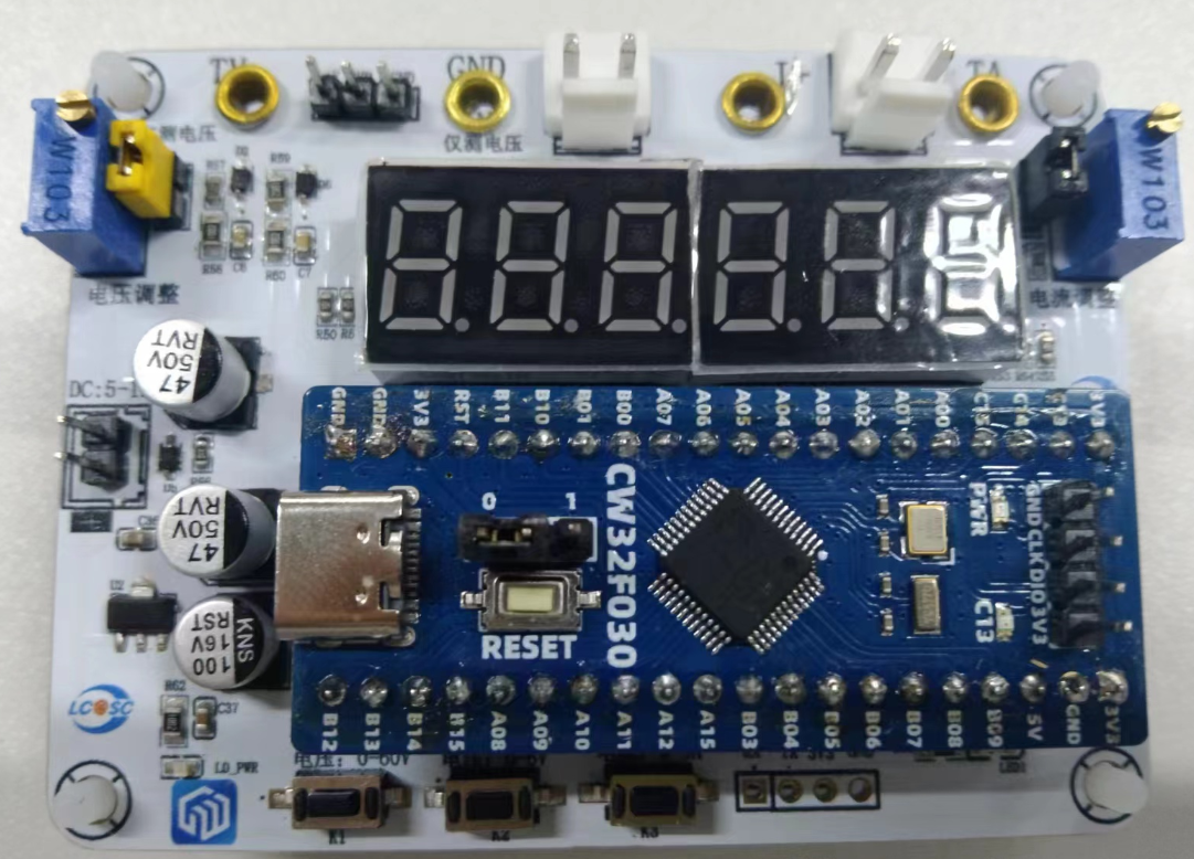 复刻电压电流表训练营的基于立创·地文星CW32的电压电流表,方便快捷检测输入的电压与电流,可为其他设备提供5V,15V电压,提供0.5A,1.5A电流。上电后,默认左边数码管显示电压,右边数码管显示电流。按下K1按键可切换五种模式,默认为显示电压和电流,模式1为电压5V校准模式,模式2为电压15V校准模式,模式3为电流0.5A校准模式,模式4为电流1.5A校准模式。要调整电压和电流时要短接可调电阻旁的排针。电压通过转动左边的可调电阻来调节,电流通过转动右边的可调电阻来调节。以上四种模式校准后按K2按键把数值写入FLASH中保存。