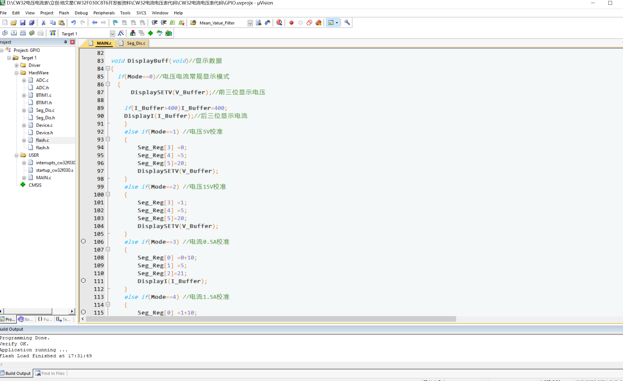 使用KEIL来编写嵌入式程序。首先要打开时钟,配置GPIO口初始化。配置好LED灯,按键和数码管。接着开启定时器,ADC模数转化来测电压和电流值。按键使用定时器外部触发,LED也使用定时器一秒闪烁。