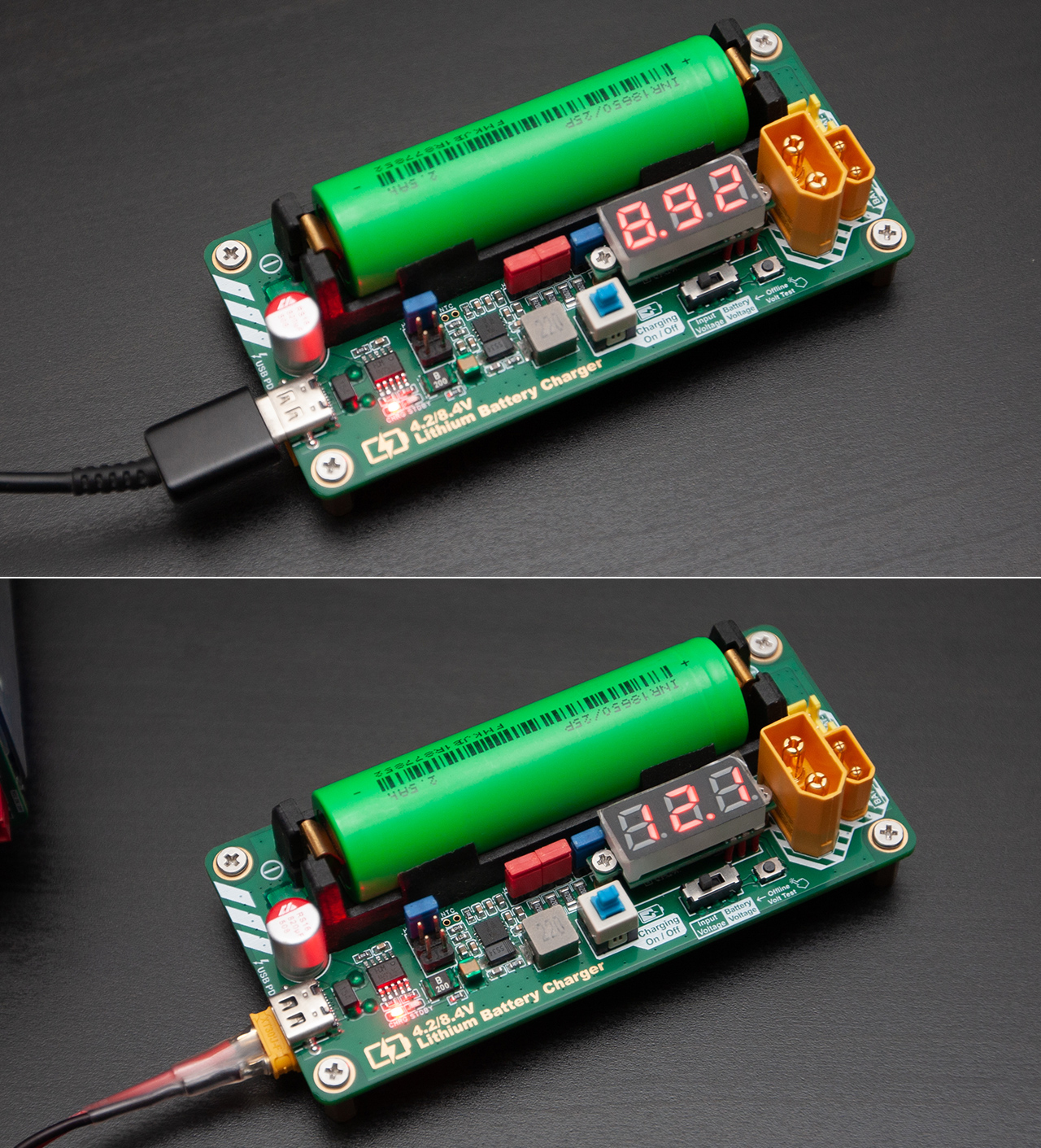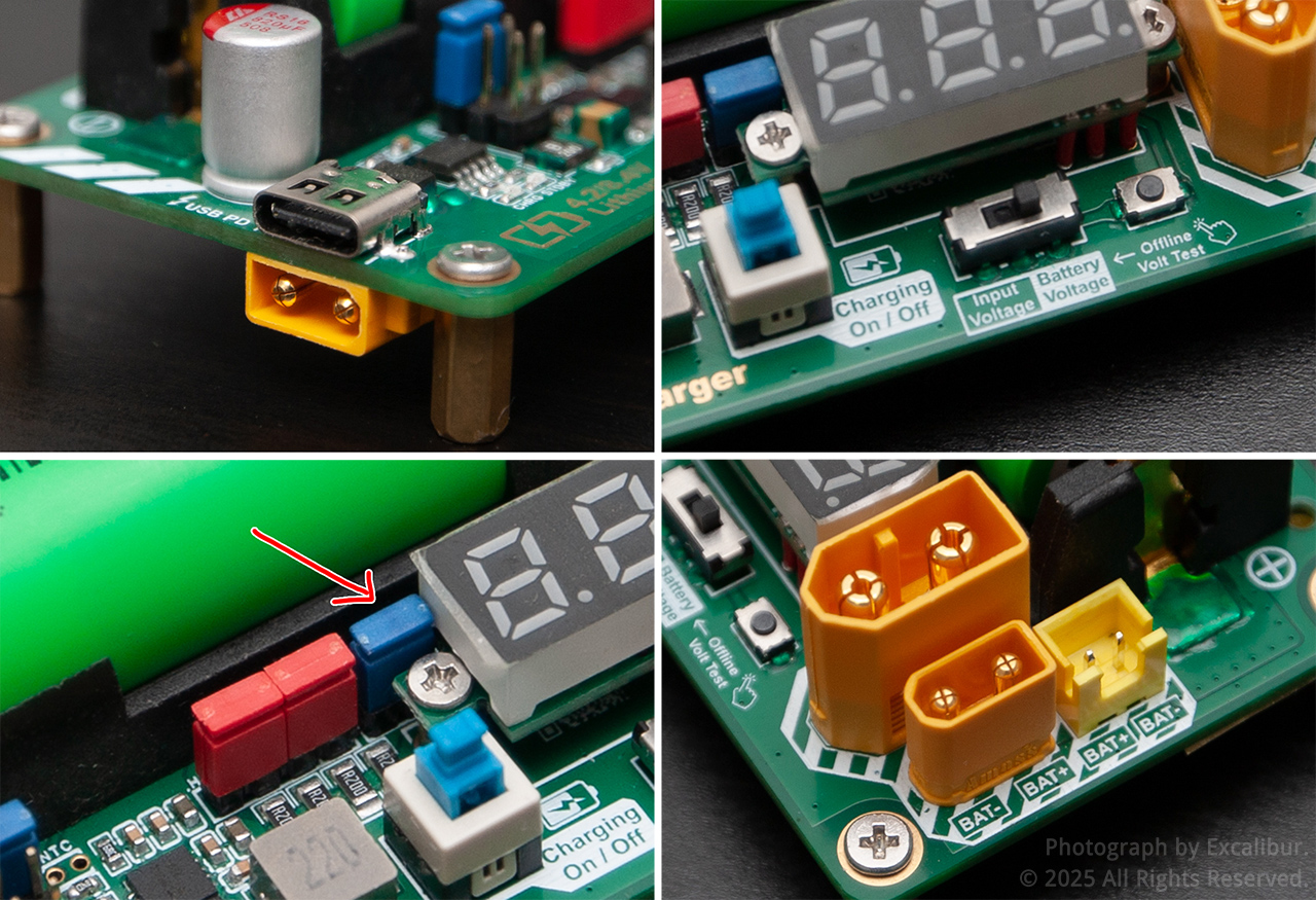 2. 可适配18650/21700单体电池,或通过XT60/XT30/XH2.54接口,为1s/2s软包电池充电。XT60/XT30/XH2.54输出口可通过跳线关断。