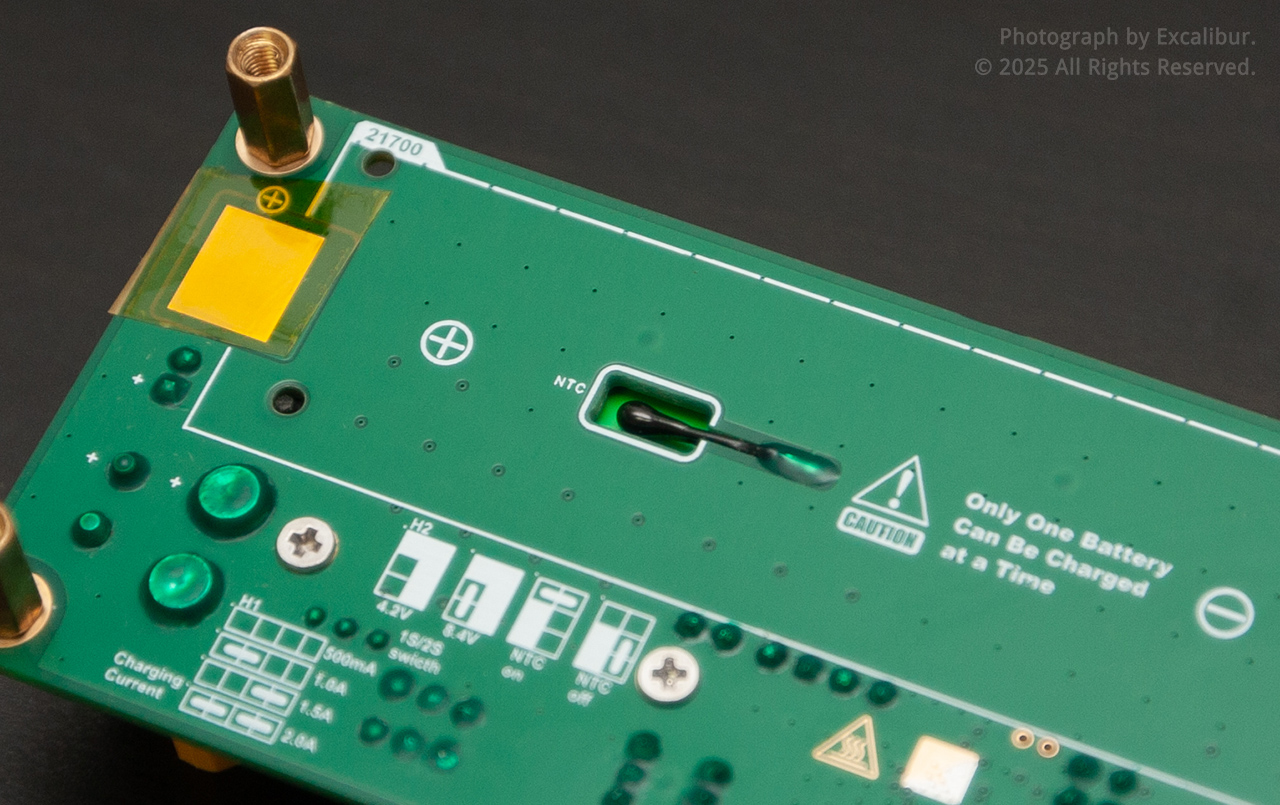 4. 具备电池过温保护功能,NTC热敏电阻探头与18650/21700电池外壳接触,或飞线与软包电池接触,设计电池充电温度范围0-45°C,也可通过跳线关闭温度保护。