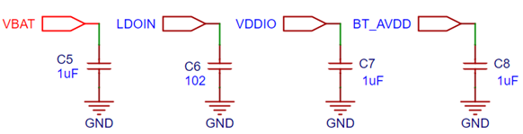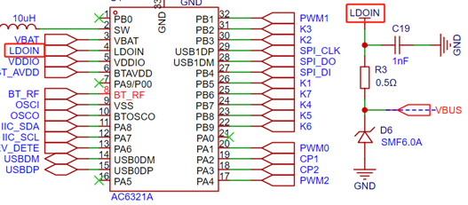 电池充电电路,本设计使用芯片内部的电池充电管理LDO对电池进行 充电管理,可提供4.2V,最大200mA充电电流。