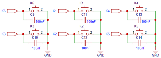 不然在旋转时没法很好的滤除干扰噪声。如果选择容值太大,会影响信号的上升沿时间;太小对旋钮的抖动很难滤除。