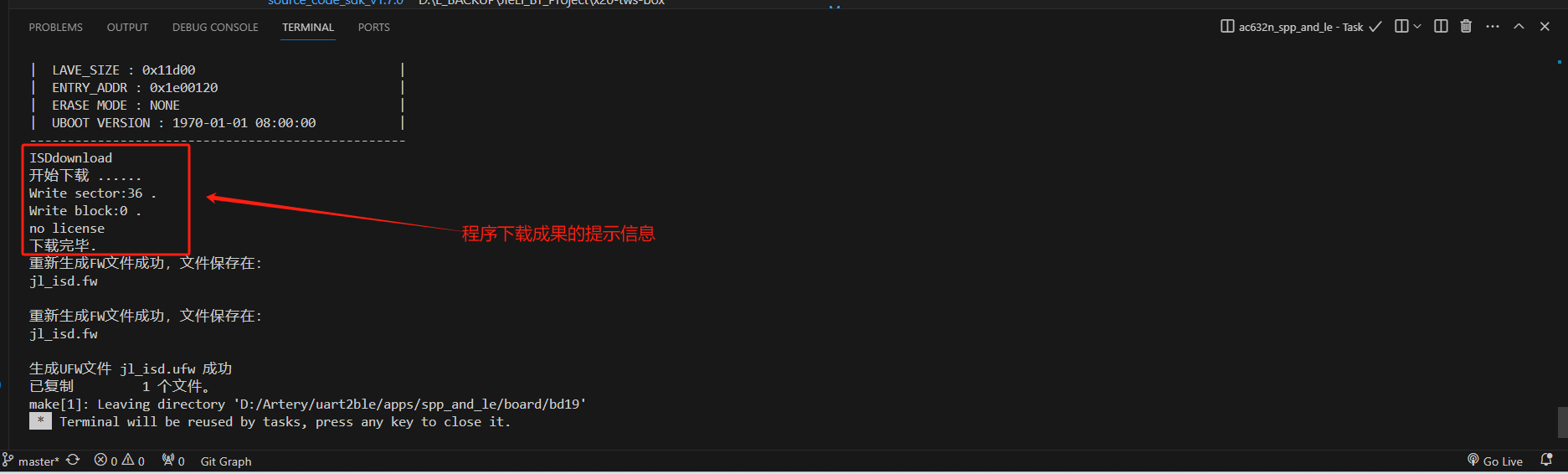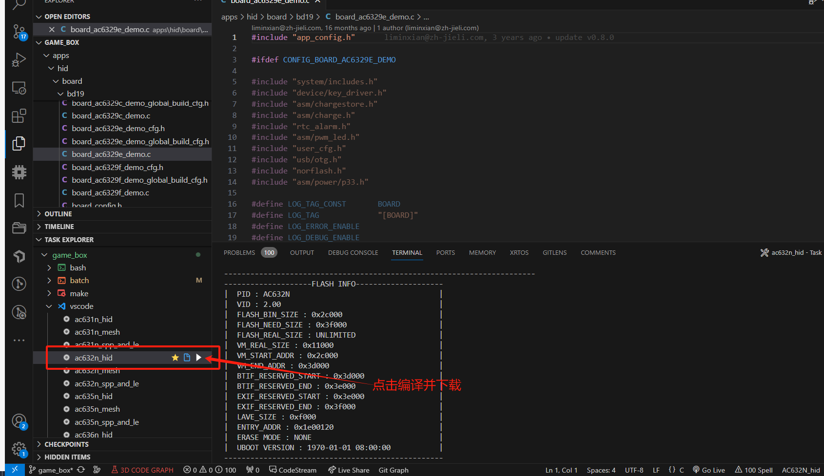 2. 用VS CODE打开SDK源代码,按如下图操作,编译并下载程序(如果你的VS CODE没有安装Task Explorer插件的话自己需按装一下)。