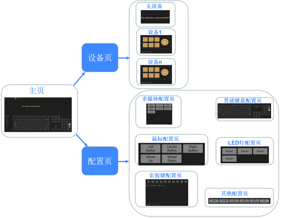 PC端上位机的软件UI由两部分组成,分别是设备页和配置页,设备页面根据产品系列又可以分成很多设备页面;配置页由6个页