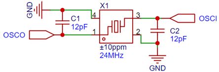 时钟电路,为芯片提供24Mhz的时钟信号,两个负载电容容值需根据晶振数据手册选定,本设计选定为12pF,晶振误差范围±10ppm