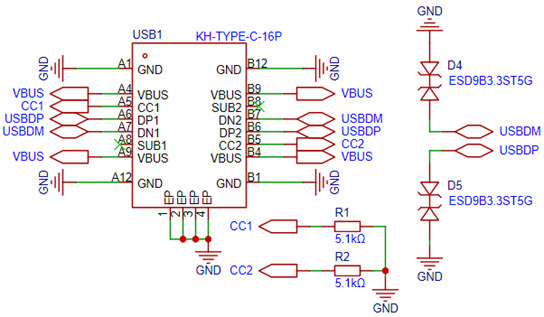 由TYPE-C接口和两个CC口对地的5.1k下来电阻组成。至于为啥是5.1k的电阻而不是其他阻值的电阻,可以查看 USB中文网关于