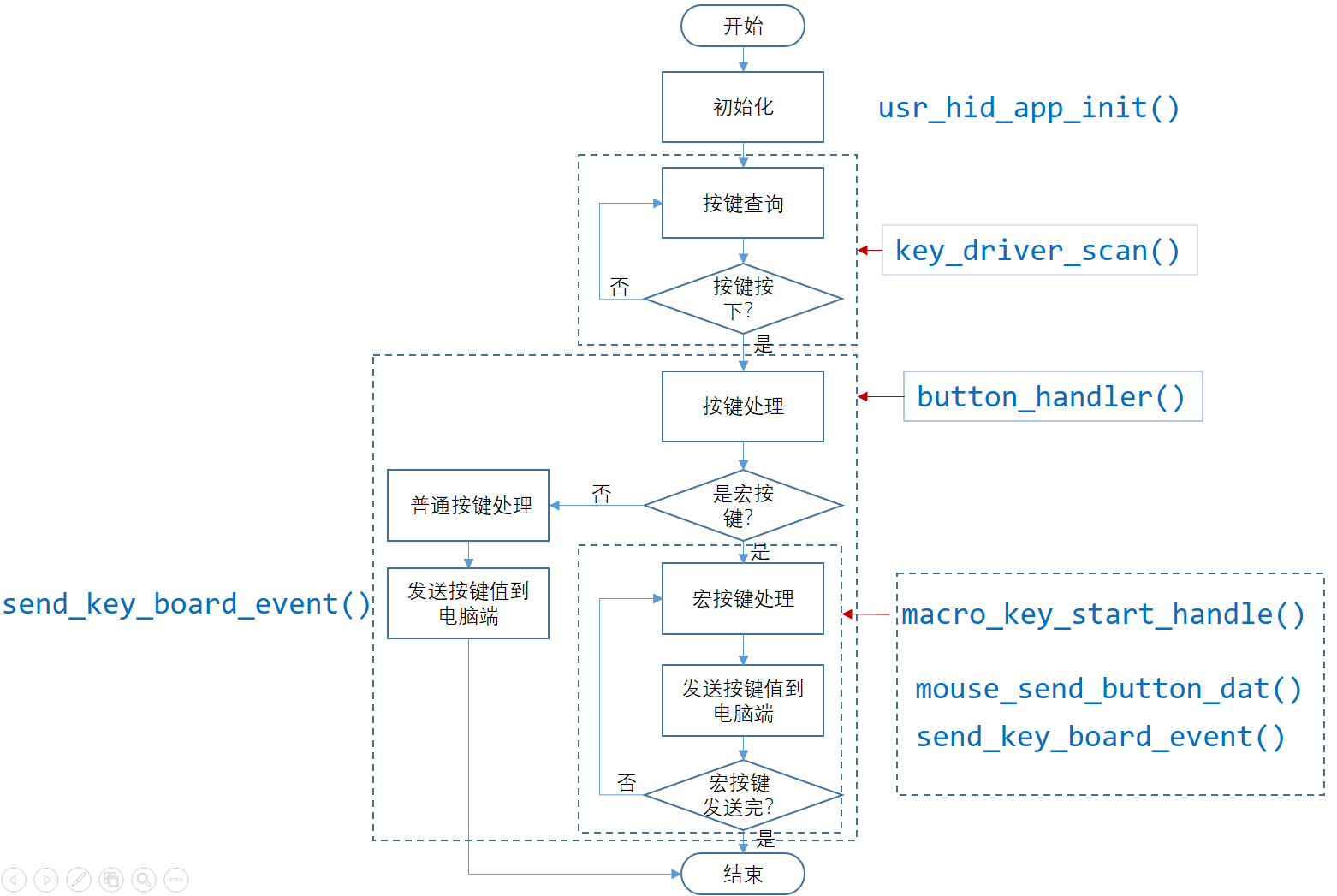 - void button_handler(u8 k_id,bool pressed);按键处理,根据配置信息对按键事件进行处理,上报按键事件给电脑。