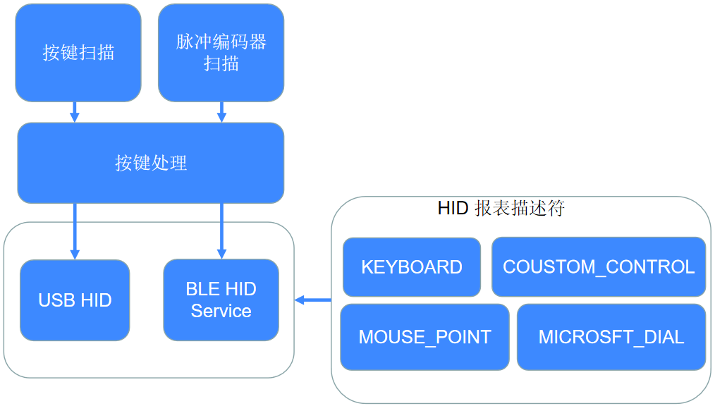 主控蓝牙软件分为按键扫描、脉冲编码器扫描、按键处理、和USB HID、BLE HID和HID报告描述符等几部分实现。如下是软件模块框图。