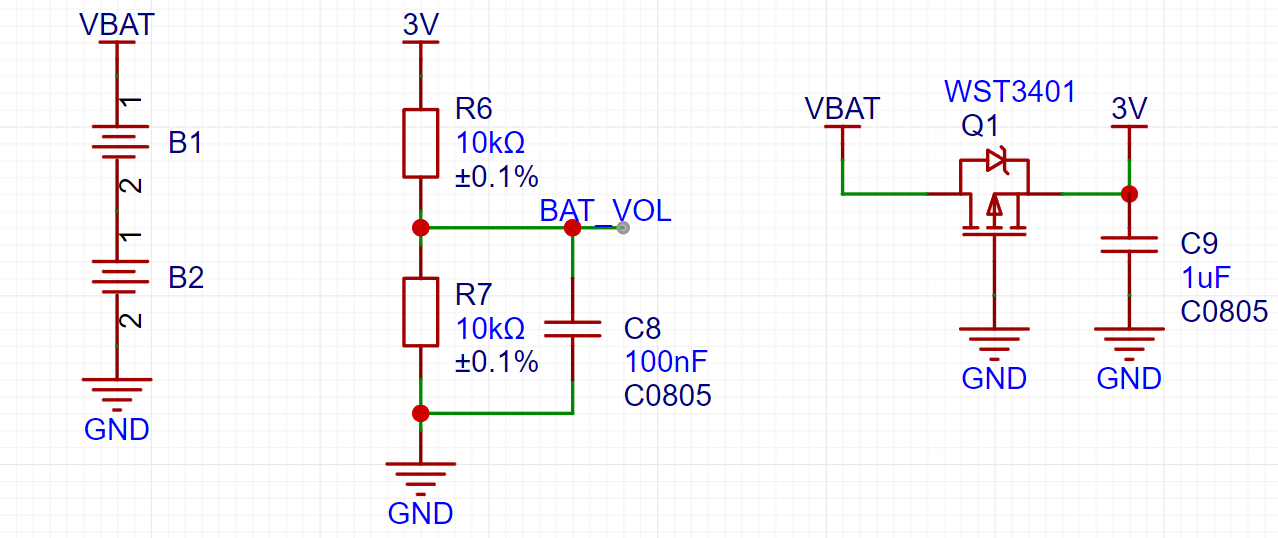 利用两节5号电池提供电源,同时通过分压器获得稳定的BAT_VOL信号;P沟道MOS管实现电池反接保护,确保电路不会因电池反接而损坏。