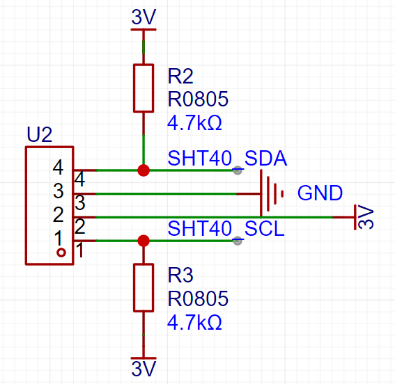 盛思锐SHT40温湿度传感器模块具有体积小,精度高等优点,因此采用该传感器进行温湿度检测。SHT40使用I2C接口进行通信,SDA和SCL分别连接到主控上的SHT40_SDA和SHT40_SCL引脚。R2和R3是4.7kΩ的上拉电阻,确保这些线在空闲状态时保持高电平。