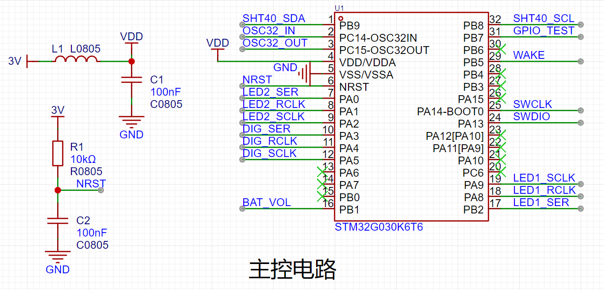 该设计以STM32G030K6T6为主控芯片,该芯片包括两个I2C总线接口、两个USART、一个I2S接口和两个SPI接口,很好的满足设计需求。