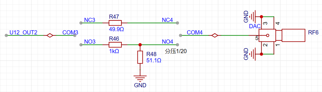 ADC为12位输出精度,当调小DAC码值输出小信号时,要想波形的电压分辨率达到7位精度,也就是波形的垂直分辨率有128个点,只能将波形衰减128/4096=1/32,换算到输出电压范围±10V/32 =±0.3215V,在±0.3125V以下更小的信号,再靠调小码值输出的话,DAC的分辨率就不足了,波形上的台阶就比较明显。所以当要输出±0.3125V以下更小的信号的时候,由直接输出切换至电阻分压将波形衰减1/20输出,确保了小信号下的电压分辨率。