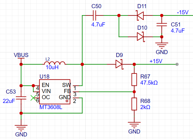 - DCDC升压及负压产生电路,原理我忘了,大概是芯片能将FB与GND之间的电压维持在0.6v,电阻配比就能输出15v。SW处电压在0~15v间来回振荡,SW输出15v时D10导通C50充电,充满电后C50压差为15v;SW输出0v时D11导通C50放电,15v的压差转移到C51上,就能输出-15v
