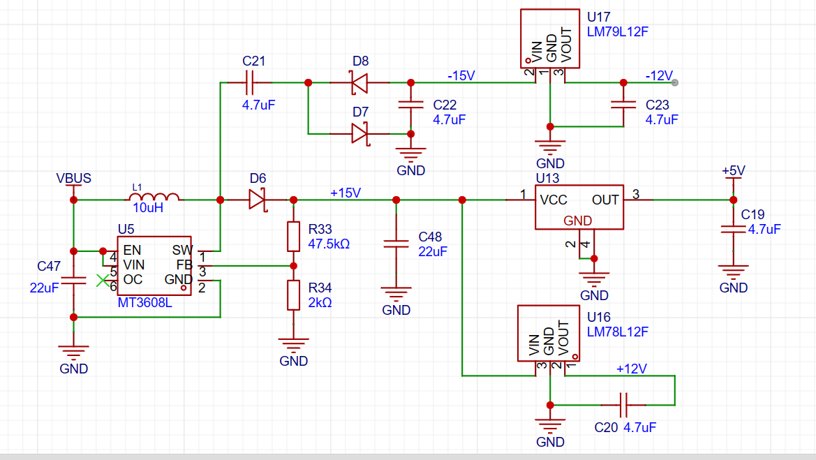 得到±15v之后就能直接通过LDO得到±12v和+5v(这里不直接使用外接电源的5v是因为后续要给模拟输出通道提供负向偏移量,外接电源波动较大而通过LDO得到的5v很稳定)