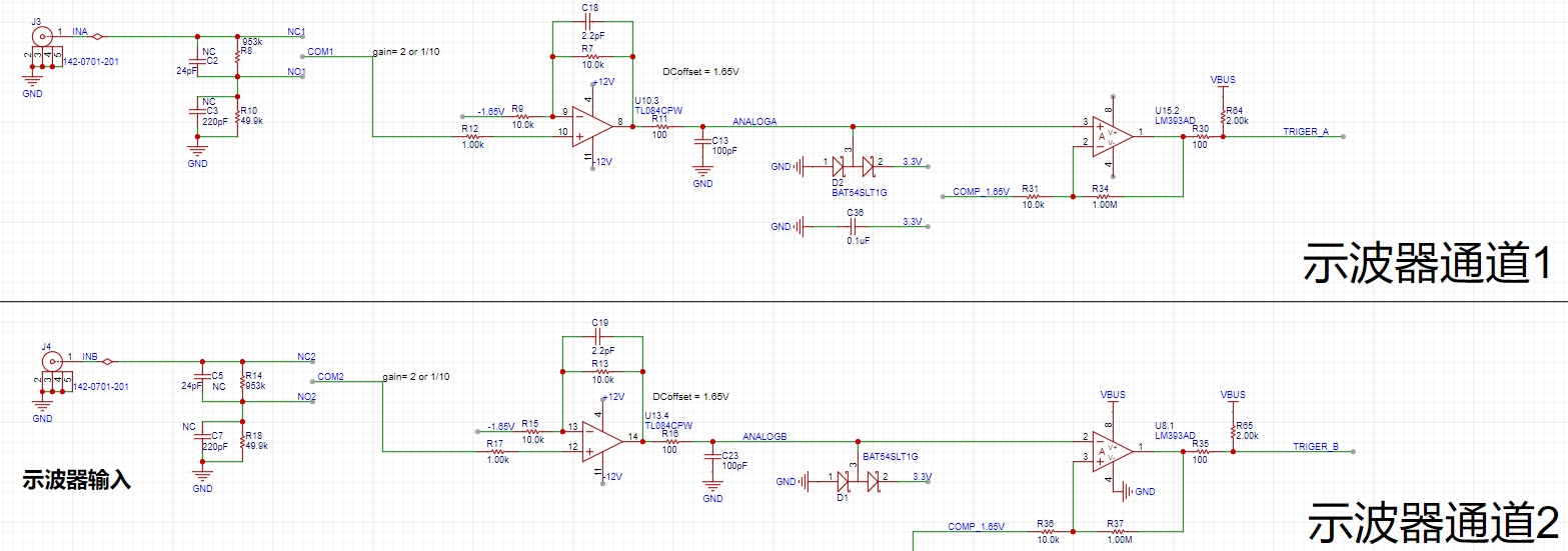 - 后级运放为滞回比较器,同相输入端输入由DAC1_OUT1产生的直流触发信号,实现方波输出,便于后续触发ADC采集信号、捕获测频等。合适的触发信号也能让波形稳定地显示