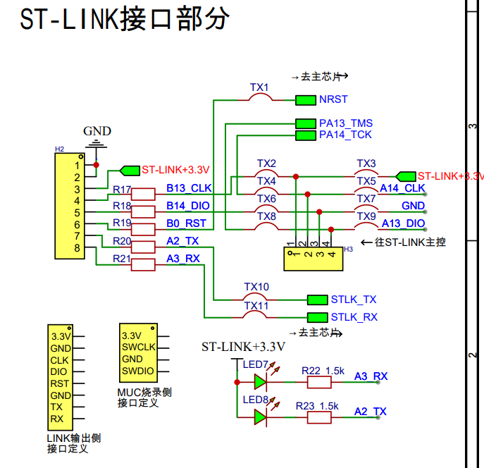 2、在TX3、TX5、TX7、TX9均在接通位,TX2、TX4、TX6、TX8均在断开位时,根据原理图显示,烧录排针线序依次为3.3V,CLK,GND,DIO。将线路按照线序依次连接到另一个ST-LINKV2-1,并上电,这时电脑检测到盘符且无报错信息。