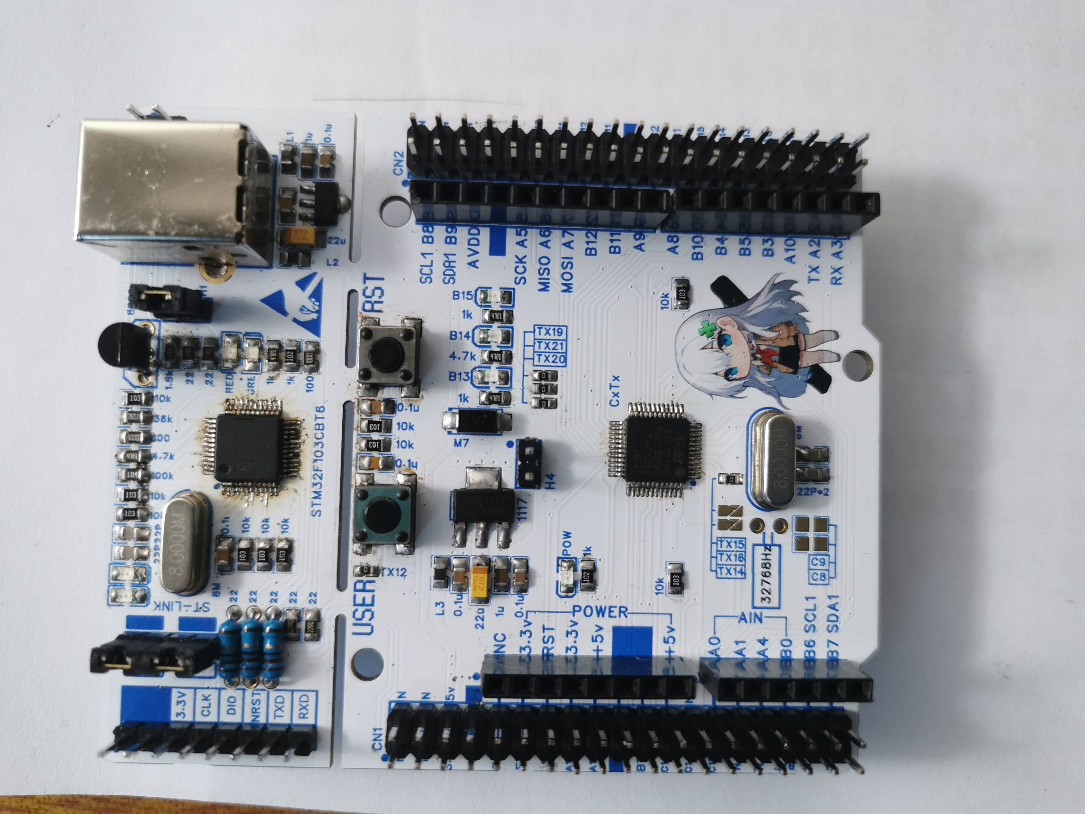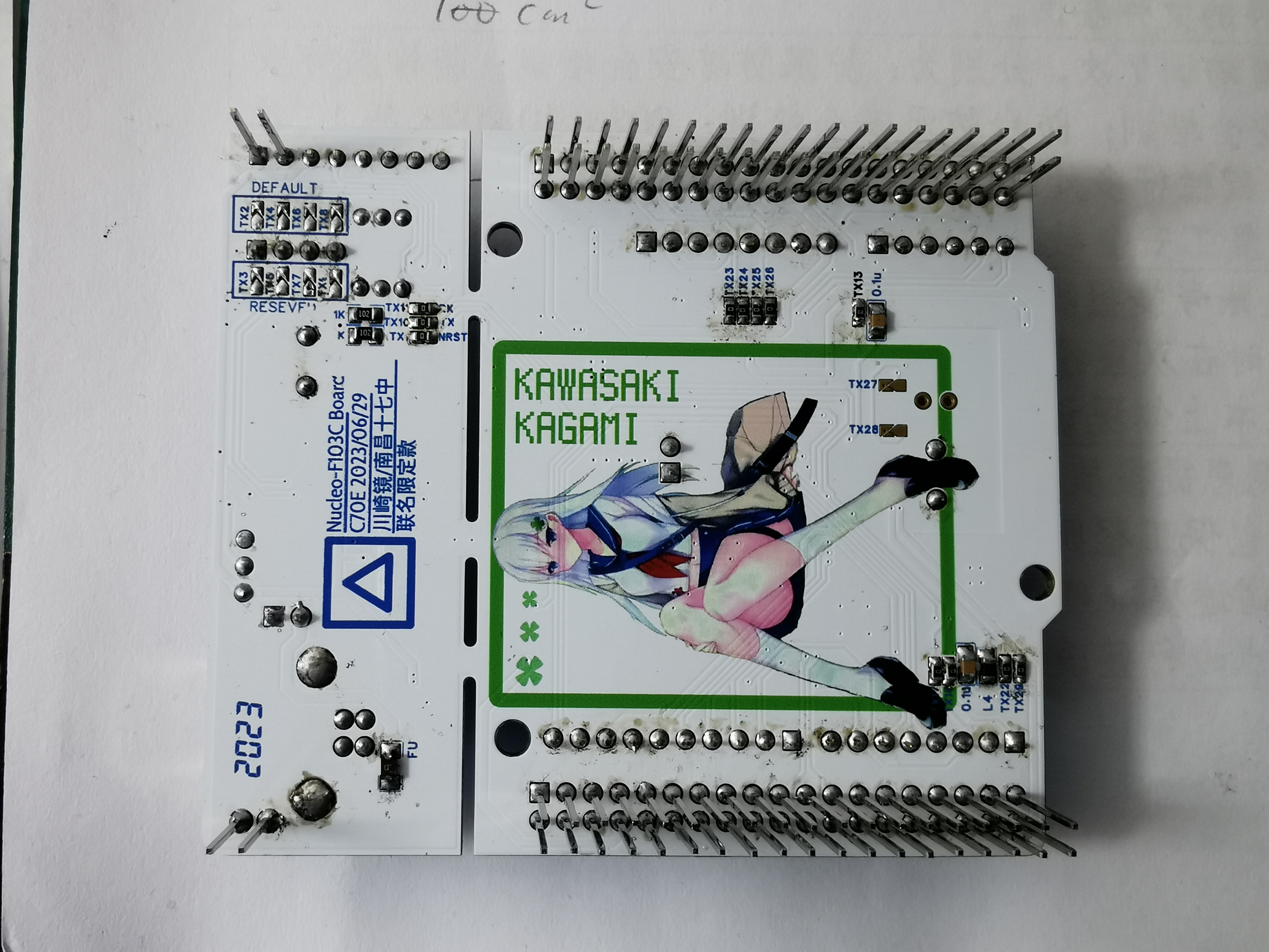 各位新年好,这里是C70E,在这里祝各位同志新年快乐,我在去年参加了嘉立创官方的彩色丝印活动,我的作品是一块开发板,参考设计是ST意法半导体的Nucleo-64以及Nucleo-48的模板来做。为了参加这个活动,我向好友“南局向段HXD1B”和“电力客车K1019次”要到了天朝铁道少女中的角色——川崎镜的一张毛巾以及在图鉴中的Q版形象(毕竟谁不喜欢白丝+白发呢?(笑)),用我稀烂的PS技术将形象抠出来,并加在了PCB上。