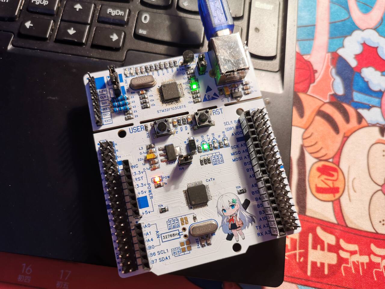 下面来说说一些没有油盐的内容,有关于活动和彩绘。在这里向嘉立创的工作人员点个赞,在这块板子完成初期,板框外有一个过孔没有被发现,他们制造前直接打电话告知,并且在退单后也返还了彩色丝印的券,我第二次打样才搞定。同时也要向他们道一个歉,年底工作忙,板子早就做好了,但工程迟迟未发布。直到今天才上传,不过也总算是更新了;接下来,介绍一下彩绘的主角川崎镜。她来自一个比较冷门的IP——“天朝铁道少女”,在平行世界观中她是CRH2A型动车组列车的研发人员,也算是在这个IP中我最喜欢的一个角色了。她的周边很多,例如立牌,抱枕,毛巾等等,但大多数不太实用,我就一直没有买。而这次活动,我直接把她加在了这块板卡上,让她和这块板卡成为我的一个实用品。我相信不管我调试到多晚、有多累,只要我把板子翻过来,就可以看见她坐在板子后向我微笑。