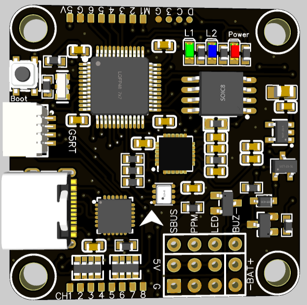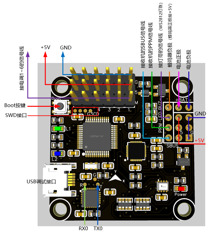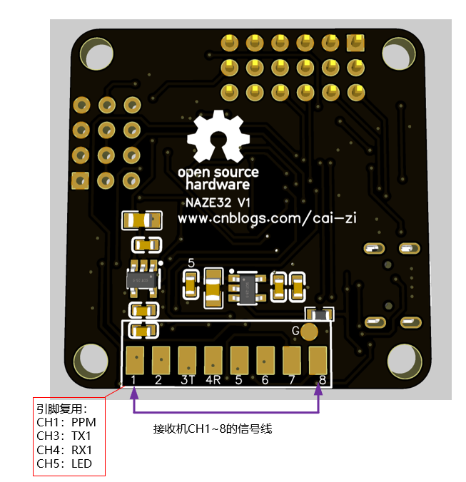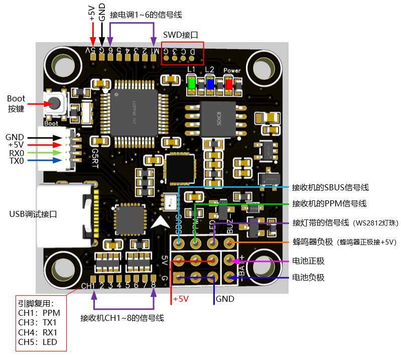 - CH1/3/4/5引脚有复用,所以当接收机连接了CH1-8,则PPM、串口1、SBUS、LED灯带将无法使用;