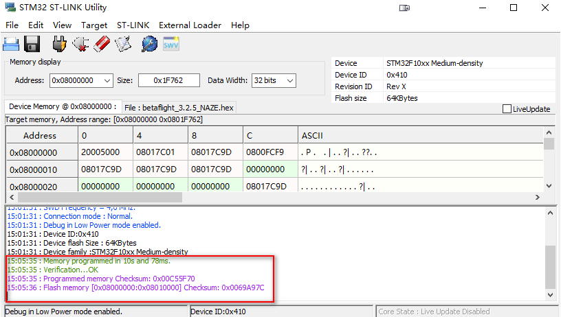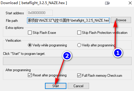 点击Browse,打开betaflight_3.2.5_NAZE.hex文件,点击Start进行烧写;