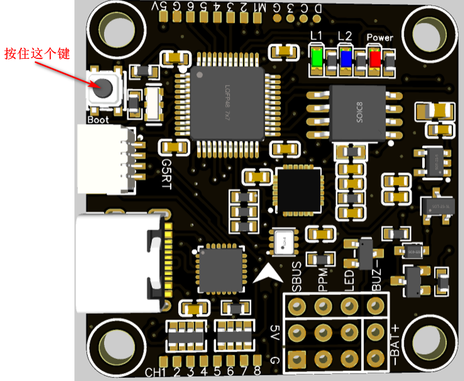 再连接数据线(没有焊接CP2104的读者需通过USB-TTL下载器连接,接法见上文,此处不再赘述),上电(飞控的L1灯不会闪烁),此时不要松开BOOT按键。