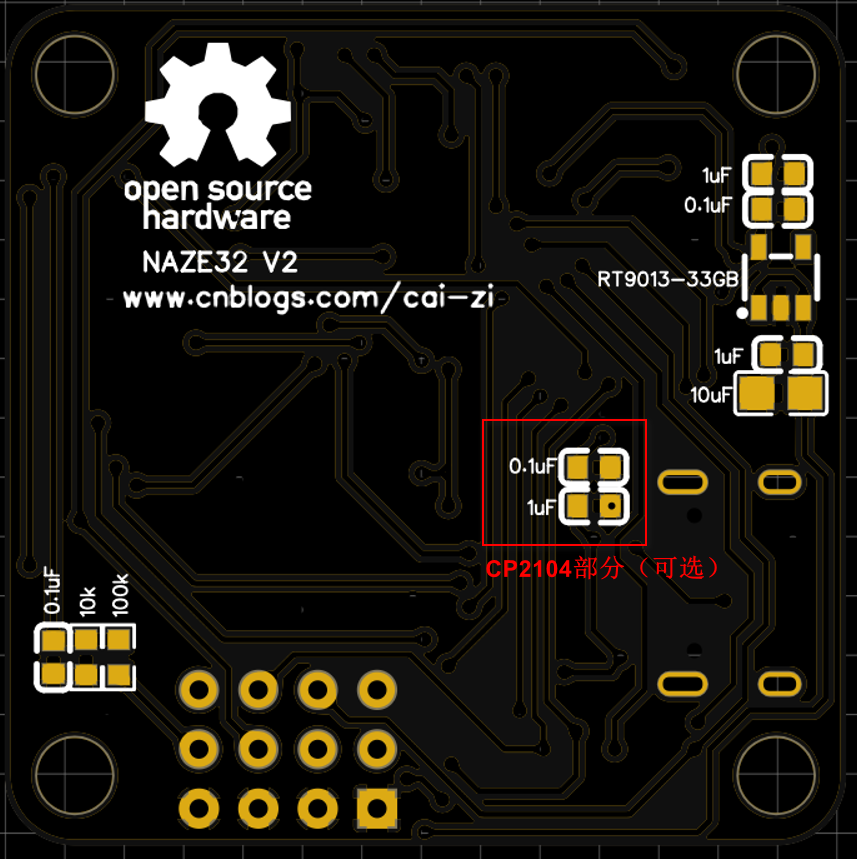 BMP280气压计部分、CP2104串口通信部分如下图所示,此版本PCB未添加SPI FLASH部分。