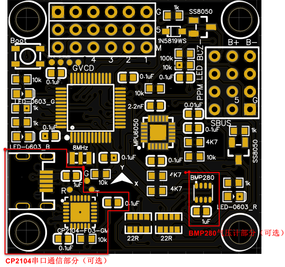 BMP280气压计用于测量无人机的高度信息,实现定高等功能。没有此部分,飞控也可以正常使用。