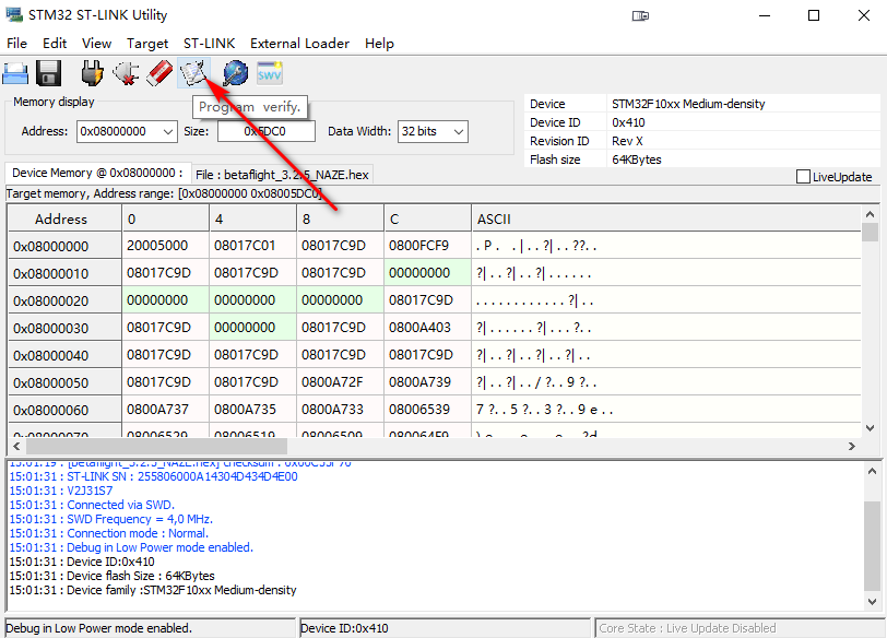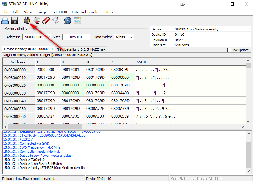 烧写正确的NAZE固件(betaflight_3.2.5_NAZE.hex,波特率115200)。